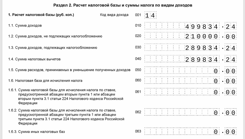Заполненная форма декларации будет выглядеть следующим образом по одному источнику дохода: