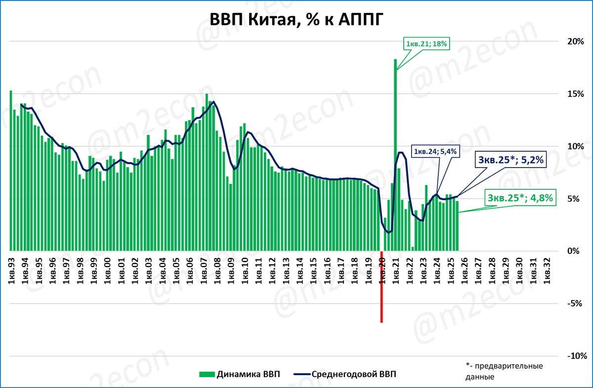 Рост первых трёх кварталов составил 5,1%. Прогноз МВФ не сбудется, для него необходимо замедление ВВП Китая в 4 квартале до 3,9%, к чему нет никаких предпосылок.