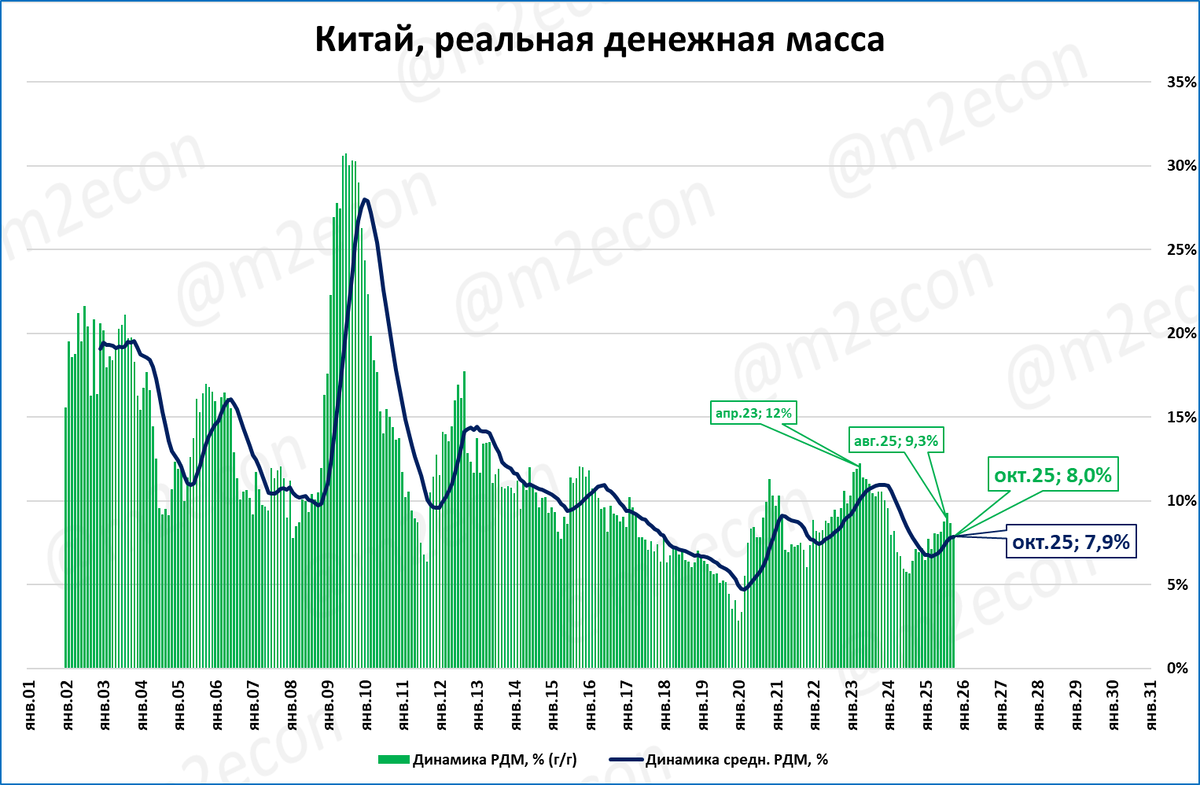 Обратите внимание: за весь период наблюдения с 2001 года, более 20 лет, реальная денежная масса в Китае ни разу не сжималась.