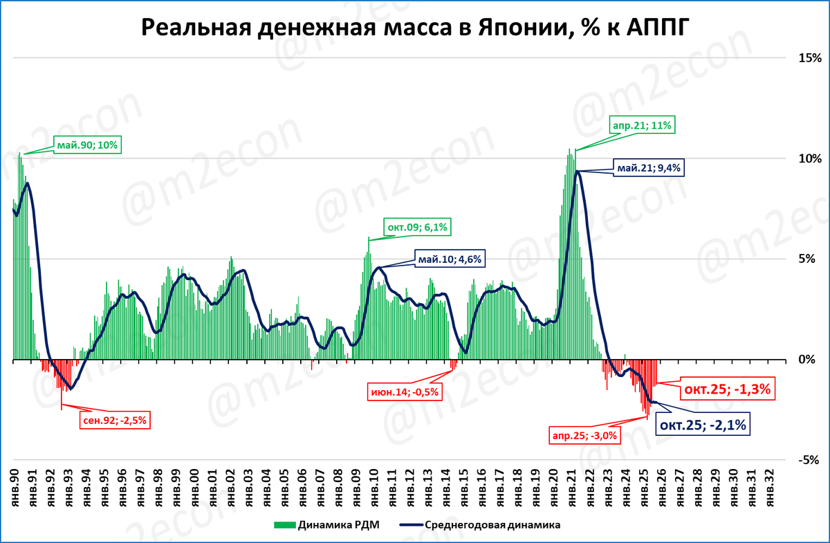 Это значит, что в реальном выражении денежная масса не растёт, а падает. Падение реальной денежной массы (РДМ) составило -1,3% к октябрю 2024 года