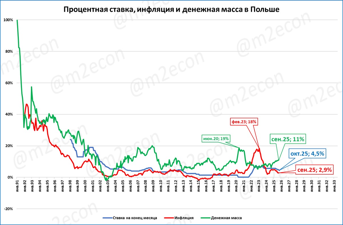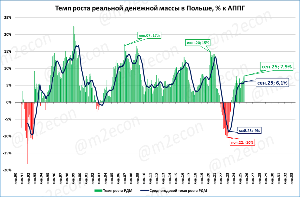 Рост реальной денежной массы в сентябре в Польше составил 7,9%