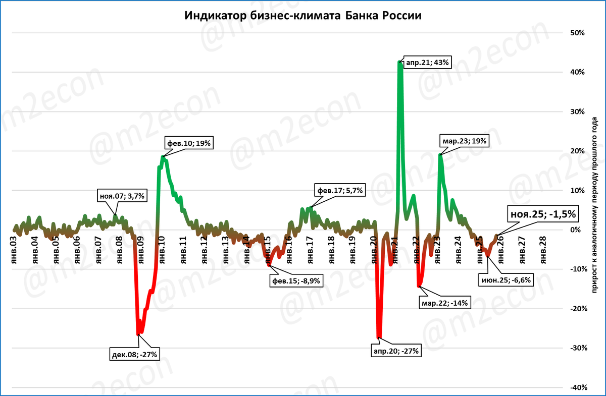 Так, в октябре индикатор бизнес-климата по версии ЦБ был 2,55 пункта. Но прошёл месяц, и данные за октябрь пересмотрены до 2,27 пункта. Тем не менее, отметим, что индикатор остаётся в положительной зоне.