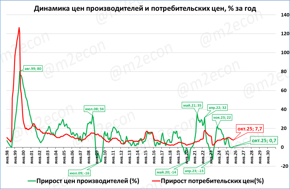 Цены производителей по итогам октября выросли: +0,7% к октябрю 2024 года. Они отстают от роста потребительских цен (+7,7%). В реальном выражении цены производителей падают (негатив).
