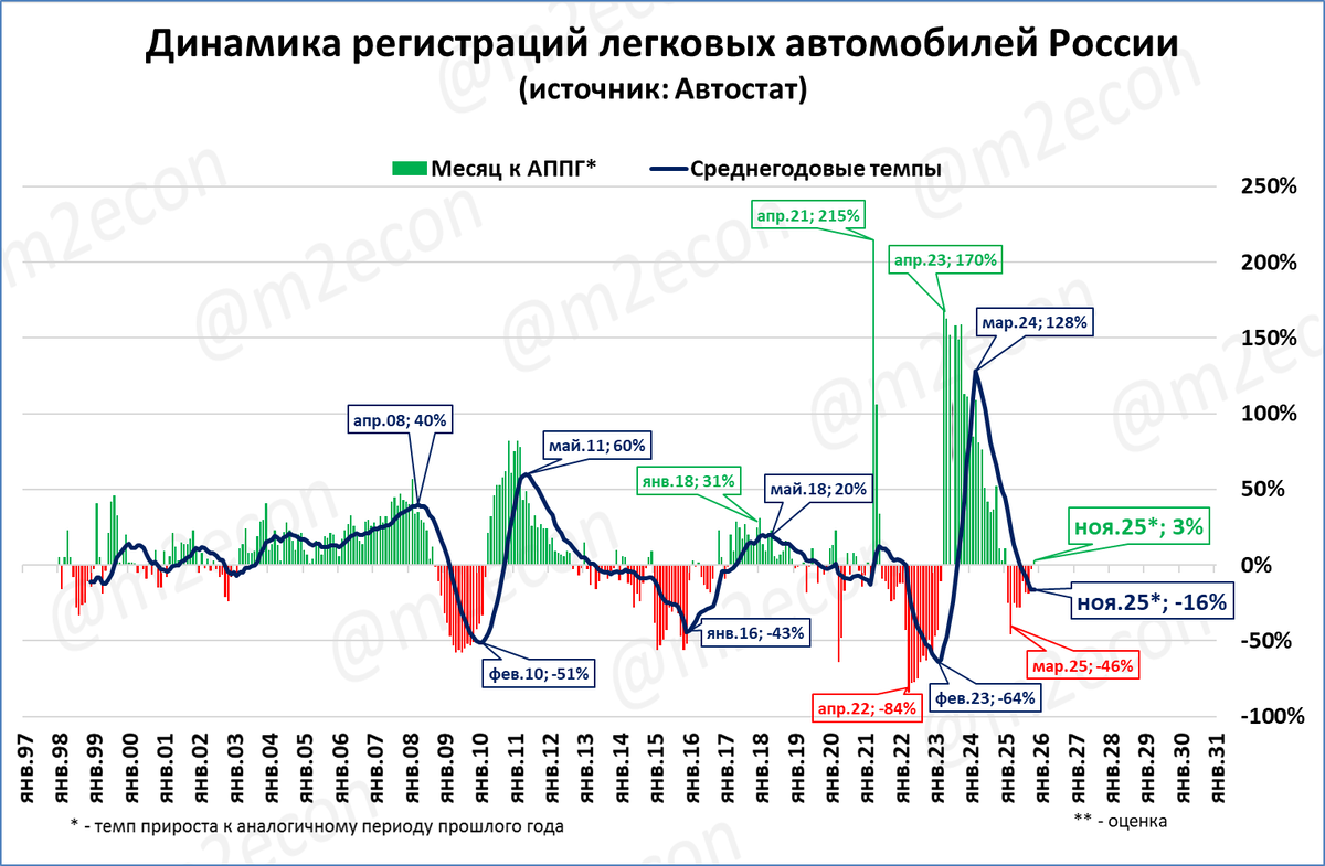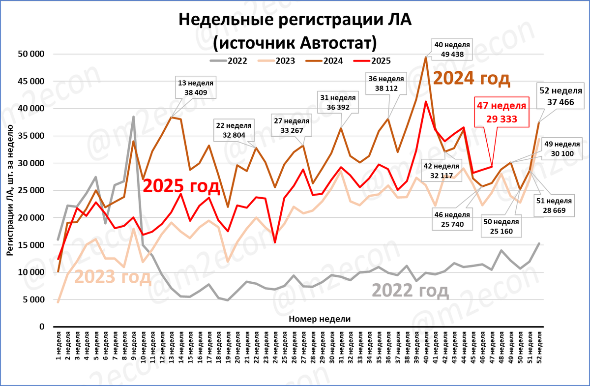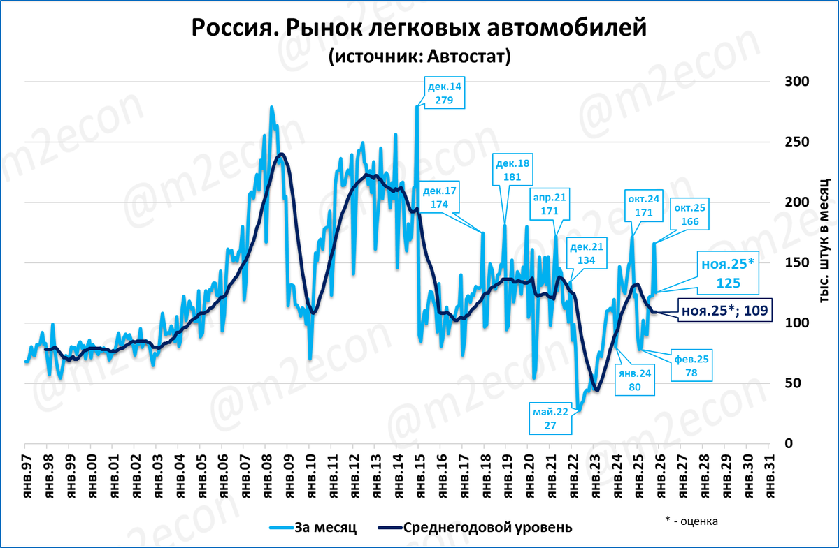 Рынок легковых автомобилей, судя данным 47 недели, в ноябре составит 125 тыс. (+3%). Это будет первый месяц роста после 9 месяцев падения. Итоги 2025 года, вероятно, будут выше 1,3 млн.