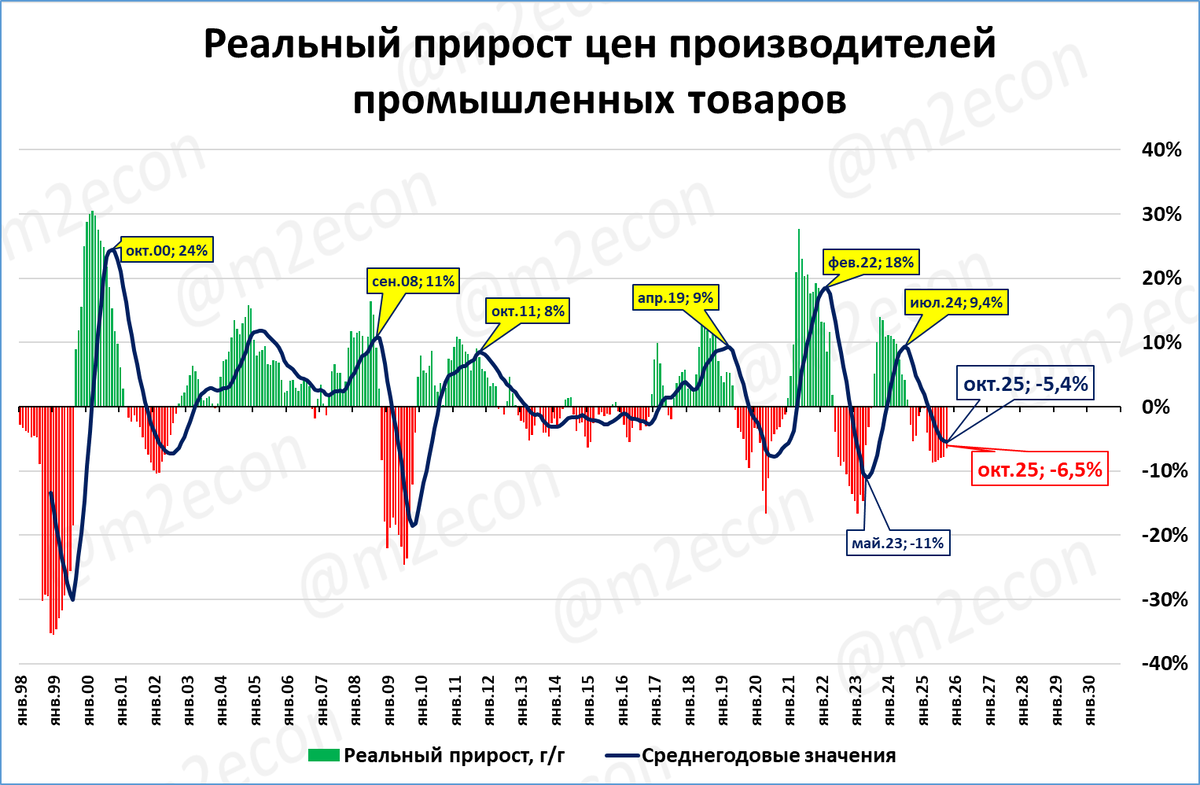 Реальные цены производителей падают, когда в экономике наблюдаются проблемы. Особенно хорошо это видно по кризисам 1998, 2008 и 2015 годов. Нынешние проблемы в экономике (резкое замедление роста ВВП) индикатор тоже отражает.
