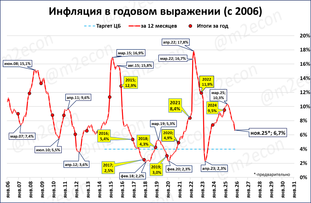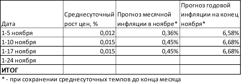 Если такой темп сохранится до конца месяца, то по итогам ноября годовая инфляция снизится до 6,7%.