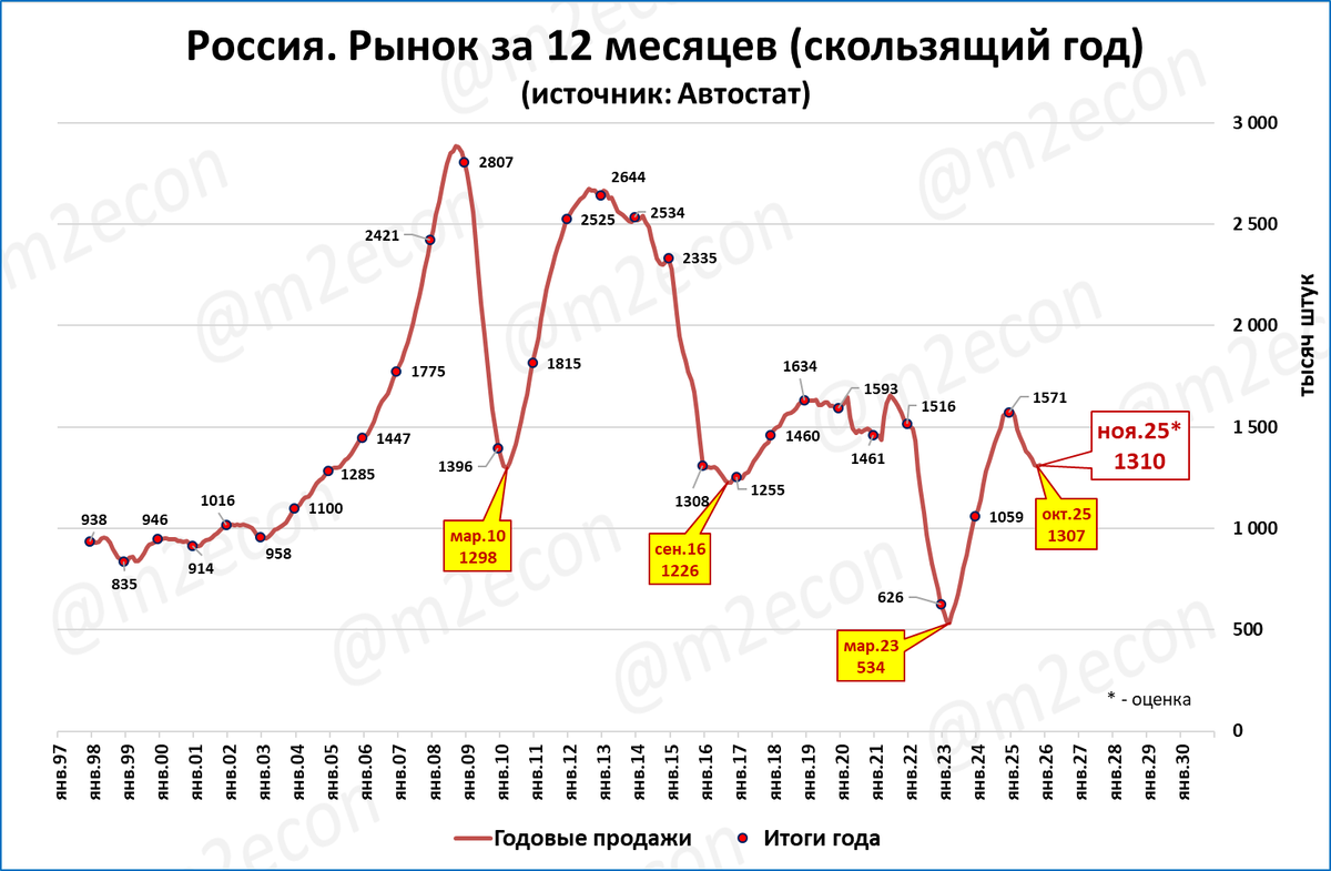 12-месячные продажи (скользящий год) так и не опустились до отметки 1,3 млн. 1,307 по итогам октября, возможно, останутся минимумом для этого цикла.