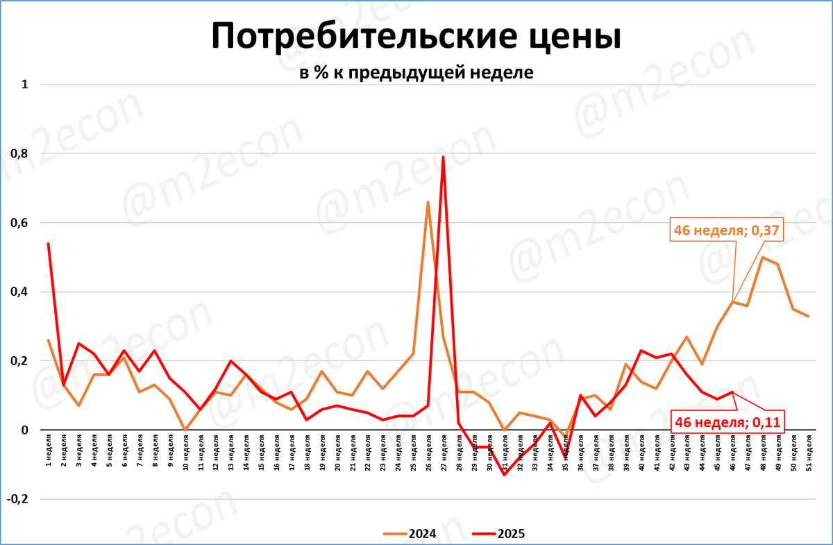О снижении годовой инфляции говорят и недельные данные. За 46 неделю цены выросли на 0,11%. Это ниже, чем за 46 неделю прошлого года (0,30%).