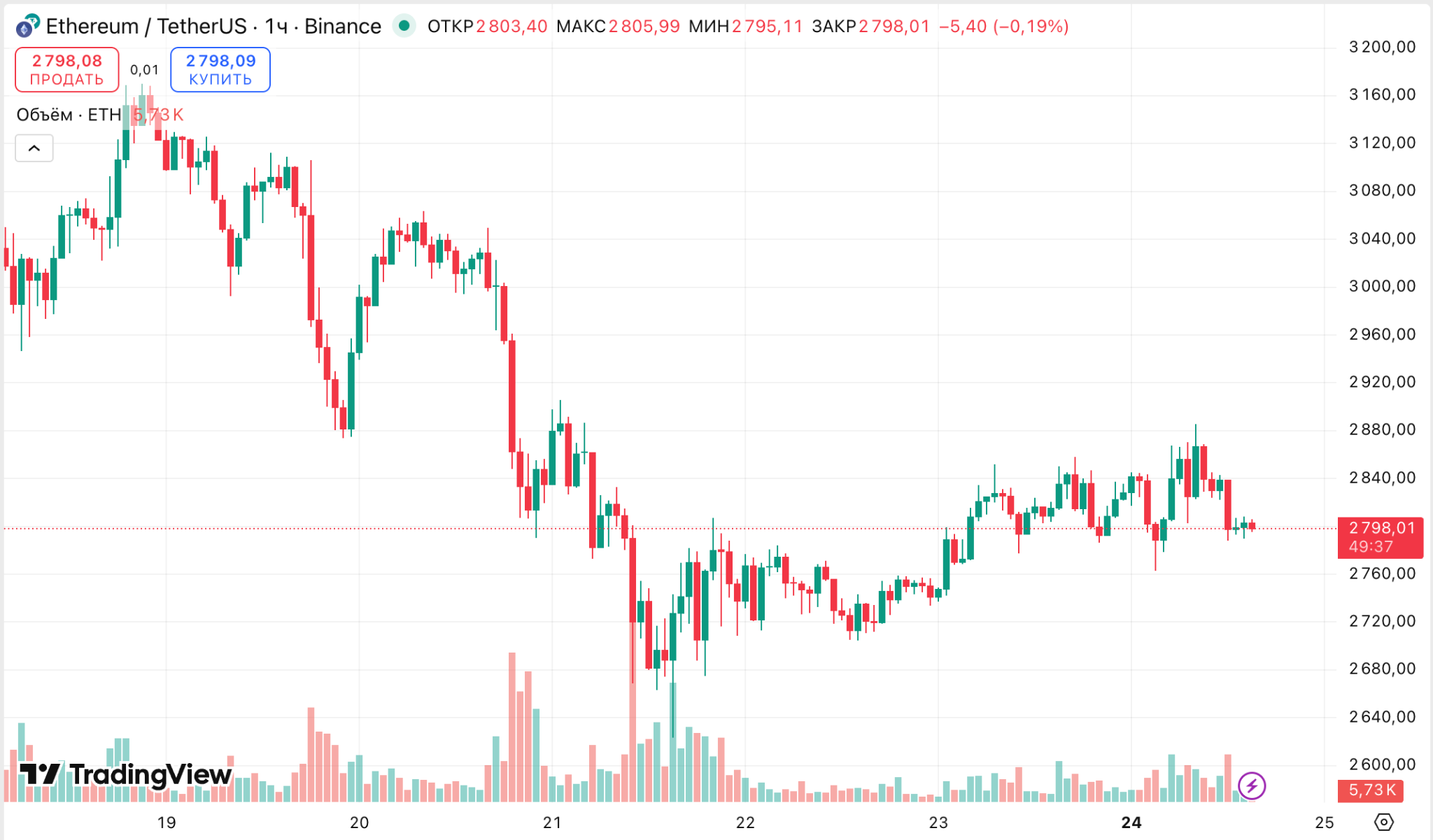 На момент написания Ethereum торгуется около $2800. За неделю котировки актива просели на 12,4%.