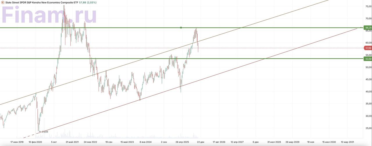 С точки зрения технического анализа на недельном графике паи фонда вернулись в долгосрочный восходящий канал после пробоя. Стоит отметить, что недавняя коррекция сняла перекупленность и на данный момент индикатор RSI составляет 27 пунктов, что уже является перепроданностью, так что разворот вверх может начаться до того, как фонд дойдет до уровня поддержки 53,5. Долгосрочно динамика выглядит позитивно.