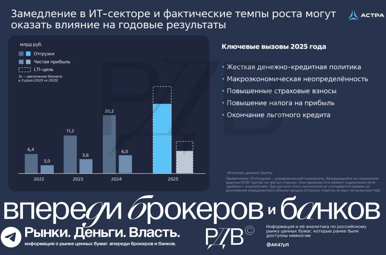 Предстоящий (27.11) отчет Астры может стать триггером для дальнейшей переоценки темпов роста в сторону снижения. Компания, вероятно, снова снизит прогнозы на 2025г. из-за большого количества вызовов, с которыми сталкивается.