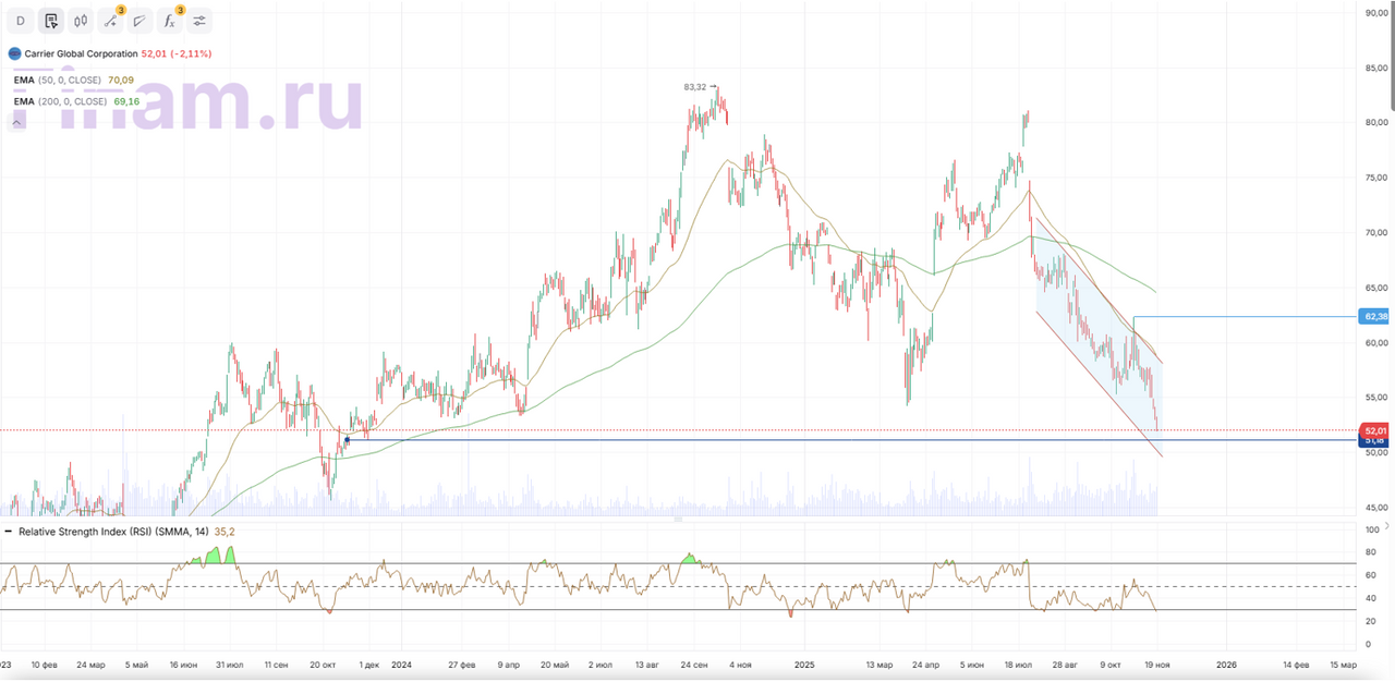 Carrier Global, производитель климатических и холодильных решений для коммерческих и жилых помещений, демонстрирует уверенный рост в коммерческом сегменте HVAC благодаря сохранению высокого спроса на инфраструктуру дата-центров и активному внедрению интегрированных систем управления. При этом финансовые показатели компании по итогам 3К 2025 оказались под давлением из-за падения спроса на жилые климатические системы в США из-за слабого рынка жилья и перехода клиентов к ремонту вместо замены оборудования. Тем не менее программа обратного выкупа акций поддерживает инвестиционную привлекательность, а положительная динамика в направлении решений для дата-центров может компенсировать слабость в других сегментах.