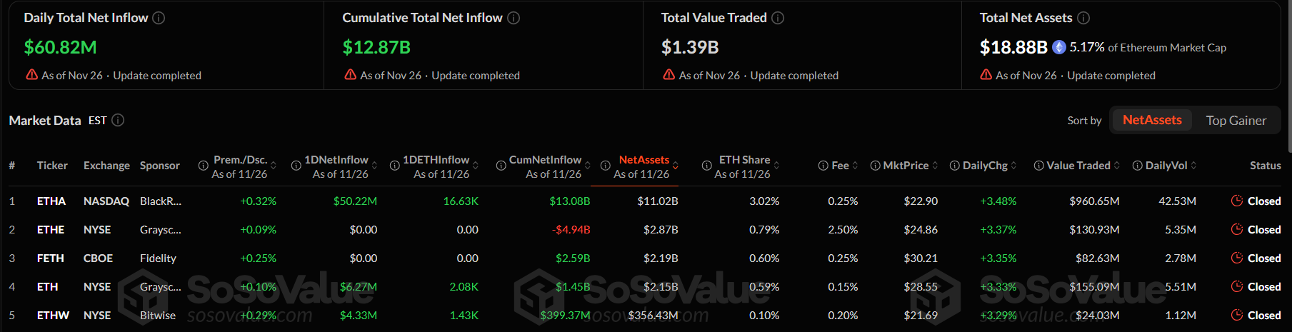 26 ноября чистый приток средств в американские спотовые Ethereum-ETF составил $60,82 млн. Позитивная динамика в секторе наблюдается четвертую торговую сессию подряд.
