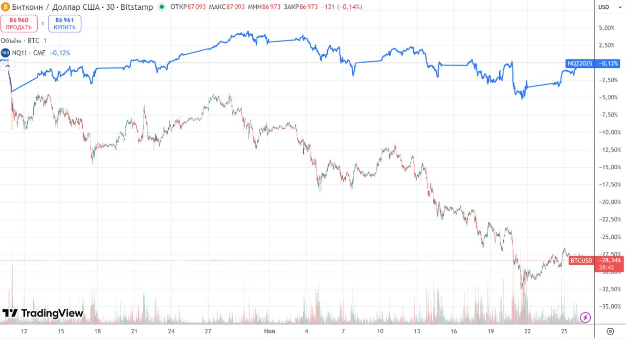 Интересная деталь: рынок акций в боковике (падают в основном ИИ-истории), а BTC просел почти –30% при 0% у Nasdaq после октябрьского обвала.