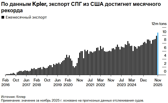 Согласно данным Kpler, в ноябре США планируют отгрузить 10,7 млн тонн СПГ, что на 40% больше аналогичного показателя прошлого года.
