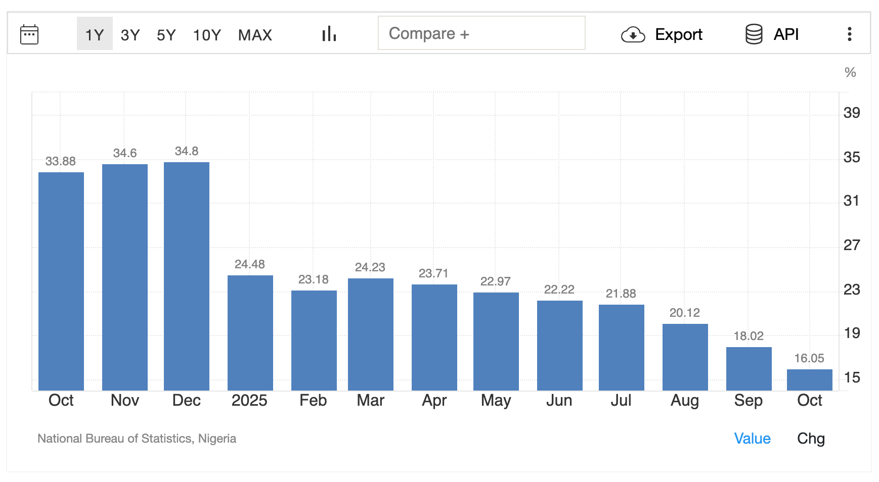 Нигерии удалось добиться значительного прогресса в борьбе с инфляцией. За год показатель снизился с 30% до 16% — минимальный уровень с 2022 года.