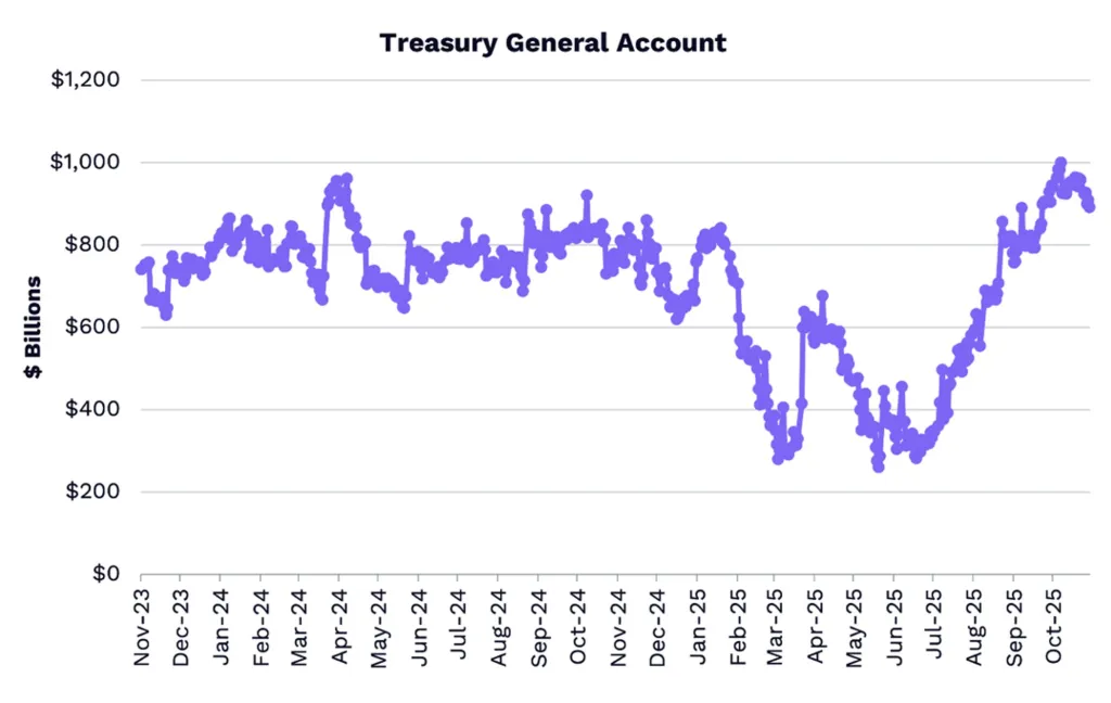По их словам, 30 октября ликвидность достигла многолетнего минимума на уровне $5,56 трлн. Продлившийся рекордные 43 дня шатдаун в США привел к оттоку средств на $621 млрд.