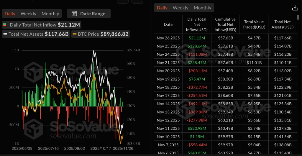 Несмотря на два дня притоков в размере $129 млн, общая динамика остается отрицательной. С начала ноября ETF потеряли $3,5 млрд — второй худший результат с момента запуска инструментов.
