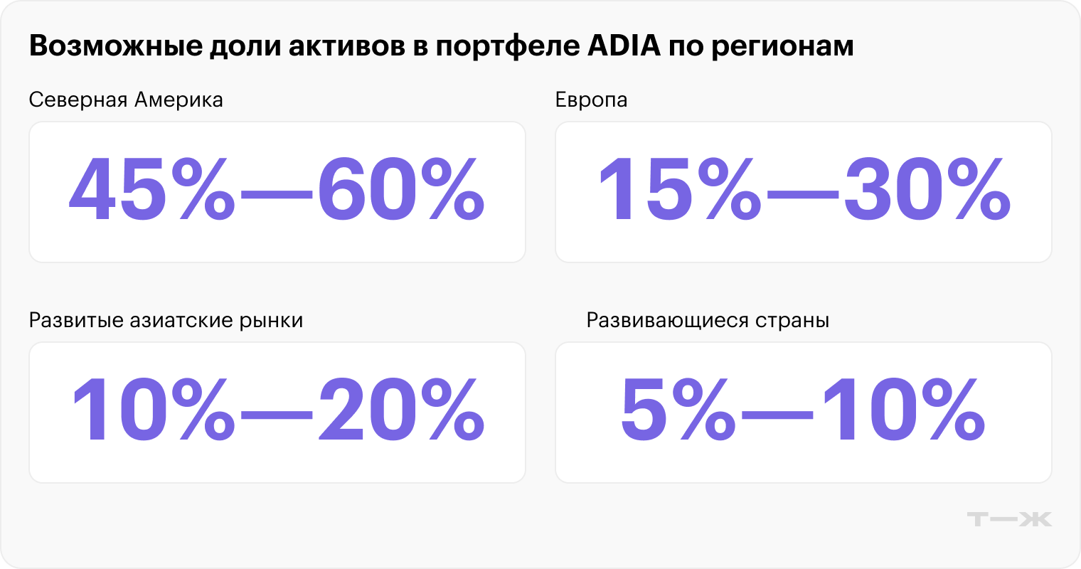 Диапазоны аллокаций активов по географическим регионам: Северная Америка, Европа, развивающиеся рынки (обычно так обозначают страны БРИКС и некоторые другие государства), развитые азиатские рынки (Япония, Гонконг, Сингапур). Источник: adia.ae