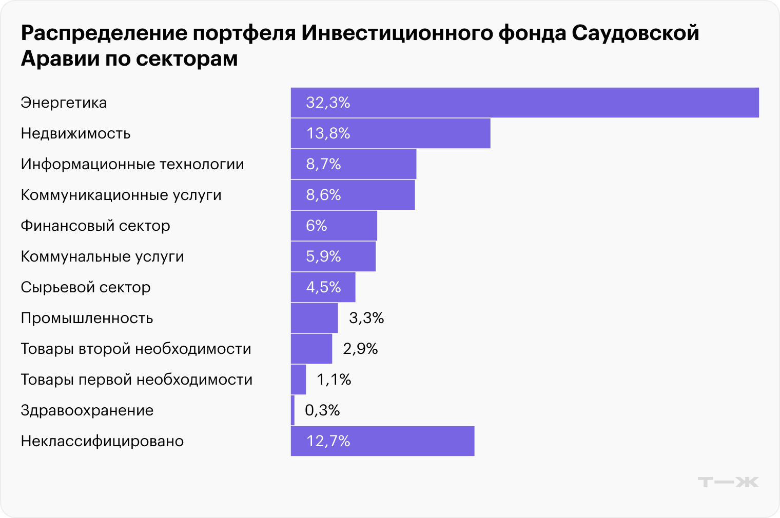 Активы фонда широко диверсифицированы по секторам: энергетика, недвижимость, услуги связи, информационные технологии, финансовые инструменты и другие. Источник: pif.gov.sa