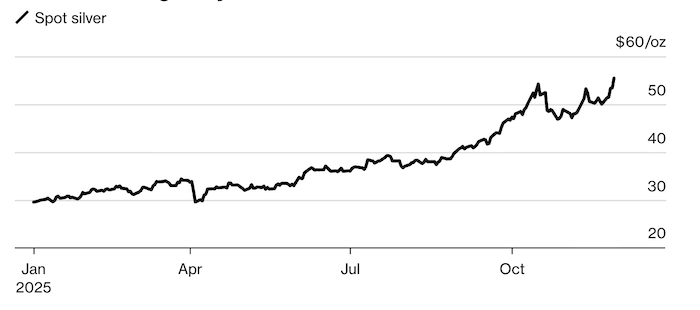 Серебро в моменте взлетело на 5,9%, достигнув $56,53 за унцию, и превысило пик, установленный во время исторического дефицита на лондонском рынке в октябре. Медь также устремилась вверх на фоне сообщений о нехватке поставок и оптимистичных прогнозов по ценам.