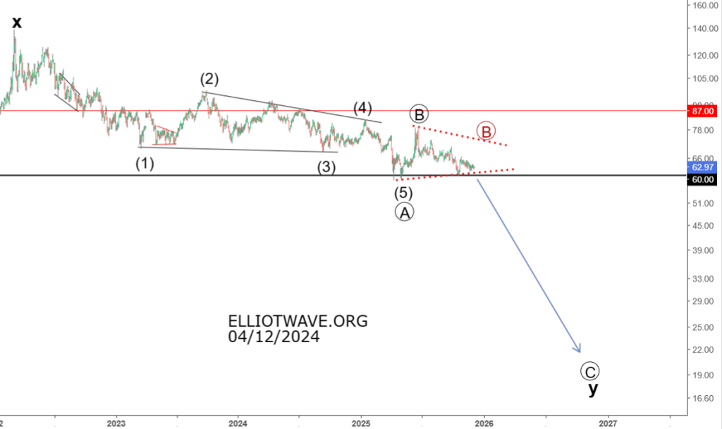 В предыдущем годовом обзоре делался такой вывод : «Формируется серия 1-2 1-2 вниз , что указывает на ускорение падения. Важный уровень сопротивления — 87 , но даже в случае его пробития это будет означать продолжение коррекции 2 или (2) . Долгосрочная цель 12 в силе , важная отметка на пути к ней — 55″ .