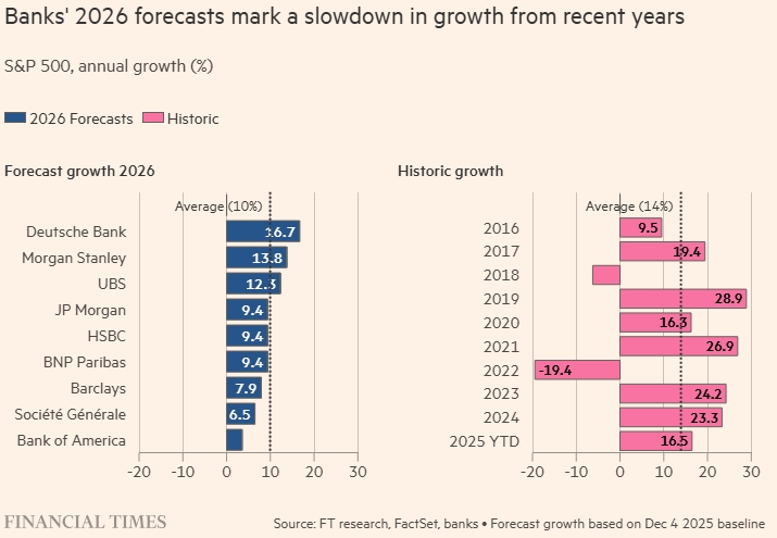 Согласно средней оценке девяти крупных банков, опрошенных Financial Times, индекс Dow Jones Industrial Average к концу 2026 года достигнет более 7500 пунктов, что примерно на 10 % выше его текущего уровня. В четверг индекс закрылся на отметке 6857, а в октябре достиг рекордного максимума в 6920.
