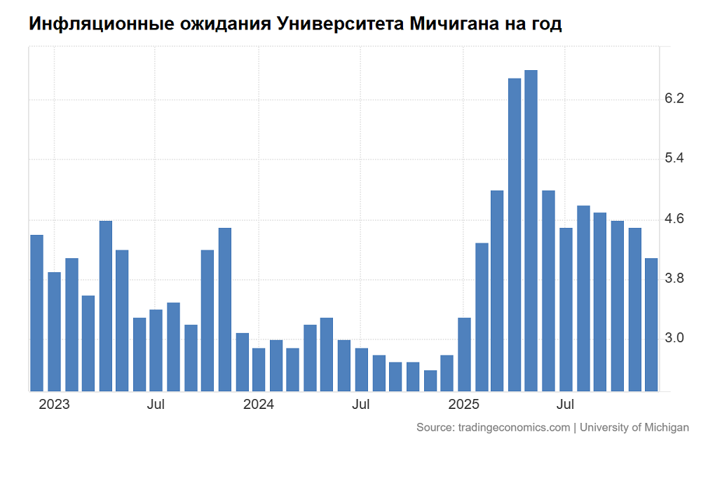 Инфляция. Как сообщила ФРС в октябре, инфляция повысилась и остается высокой. Данные немного устарели. В сентябре рост индекса потребительских цен составил 3% в годовом исчислении. В декабре инфляционные ожидания по версии Университета Мичигана составили 4,1% годовых — это минимум за четыре месяца. Большинство чиновников отметили, что со временем инфляция снизится. Однако некоторые сообщили, что не уверены в адекватности декабрьского сокращения ставки.