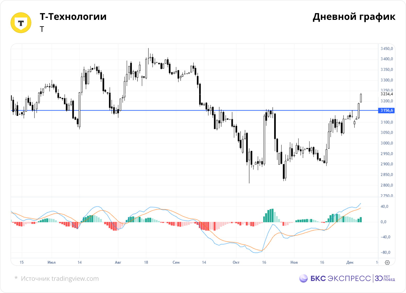 Акции Т-Технологий развивают очередную попытку роста. В этот раз бумаги движутся значительно активнее рынка. С помощью последнего импульса акциям удалось преодолеть сильный уровень сопротивления в районе 3150 руб. и закрепиться выше.