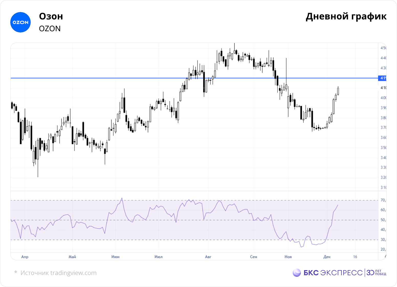 Ожидаем, что в ближайшее время бумаги Озона продолжат рост до сильного уровня сопротивления в районе 4200 и в позитивном сценарии за неделю вырастут до 4175–4200 руб. (2–2,6%).