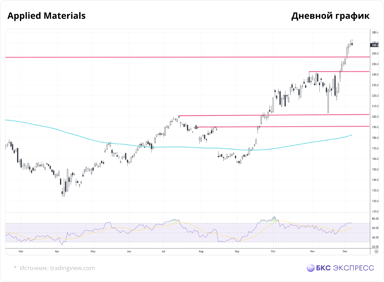 Акции достигли уровня перекупленности по RSI(14) на дневном таймфрейме. Значение на 5 декабря — $268. Возможен спуск бумаг в район $258. Консенсус-прогноз аналитиков по версии Barron’s — $253.
