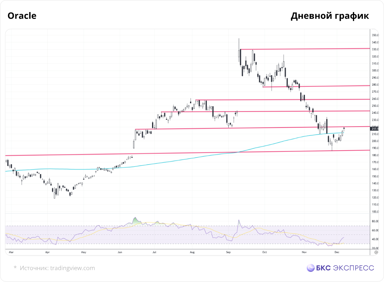Значение на 5 декабря — $218. Акции уперлись в сопротивление $220. При его пробое техническим ориентиром станут $242. Консенсус-прогноз аналитиков по версии Barron’s — $341.