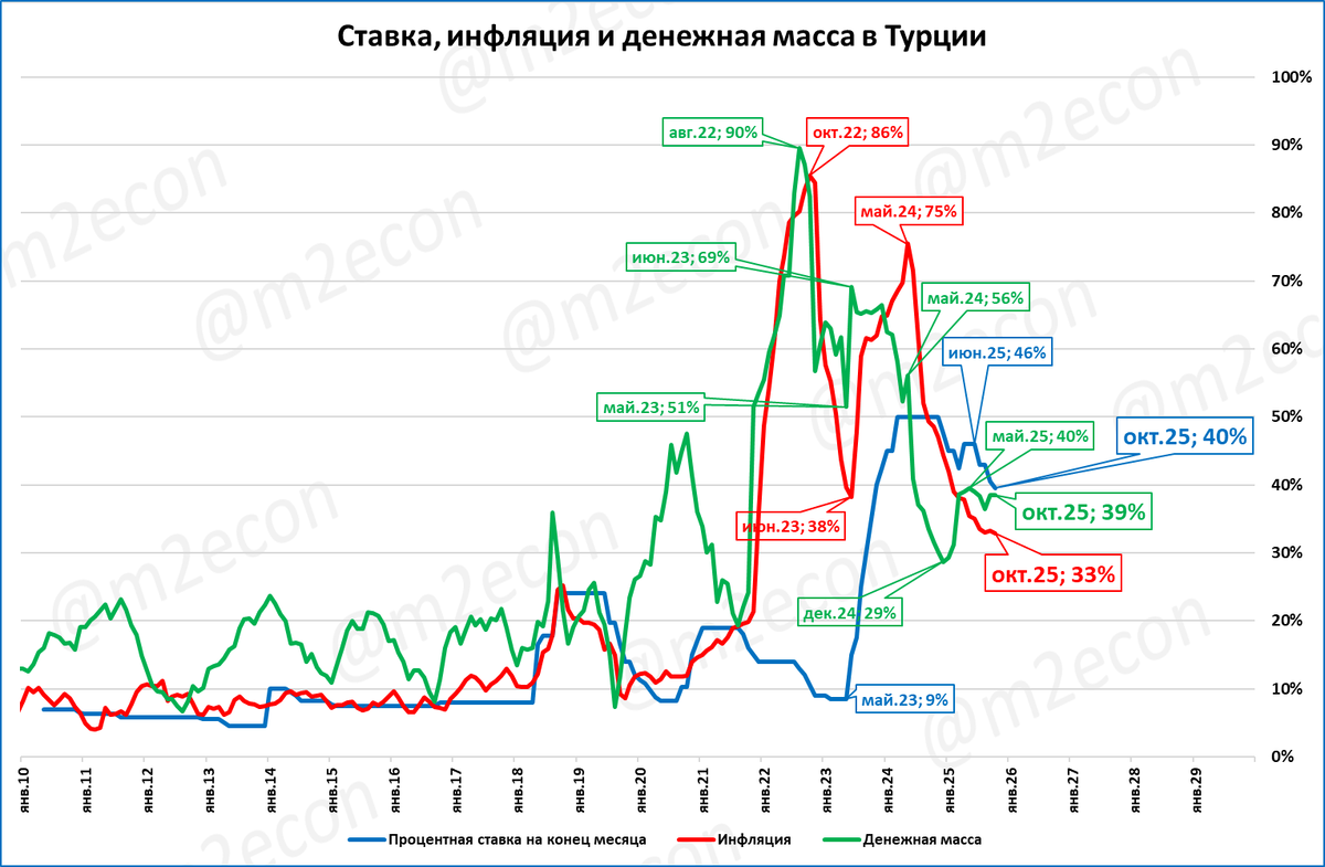 В октябре рост денежной массы Турции составил 39% к октябрю 2024 года.