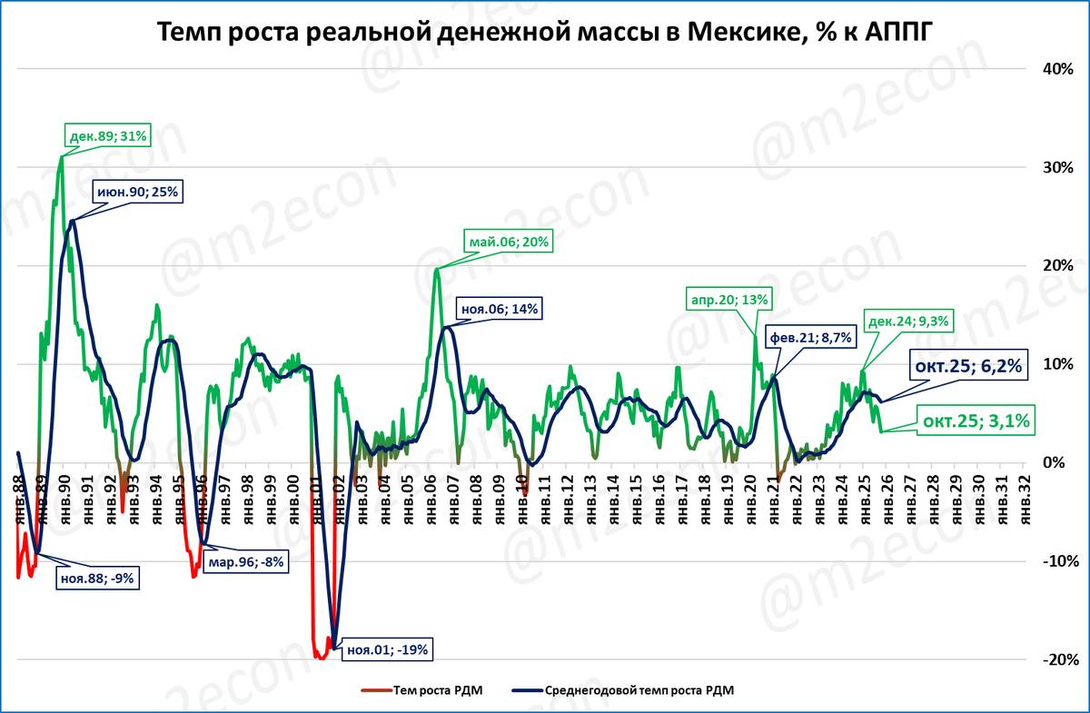 В Мексике за октябрь РДМ выросла на 3,1% к октябрю прошлого года. ВВП в 3 квартале упал на 0,1% к 3 кварталу 2024 года.