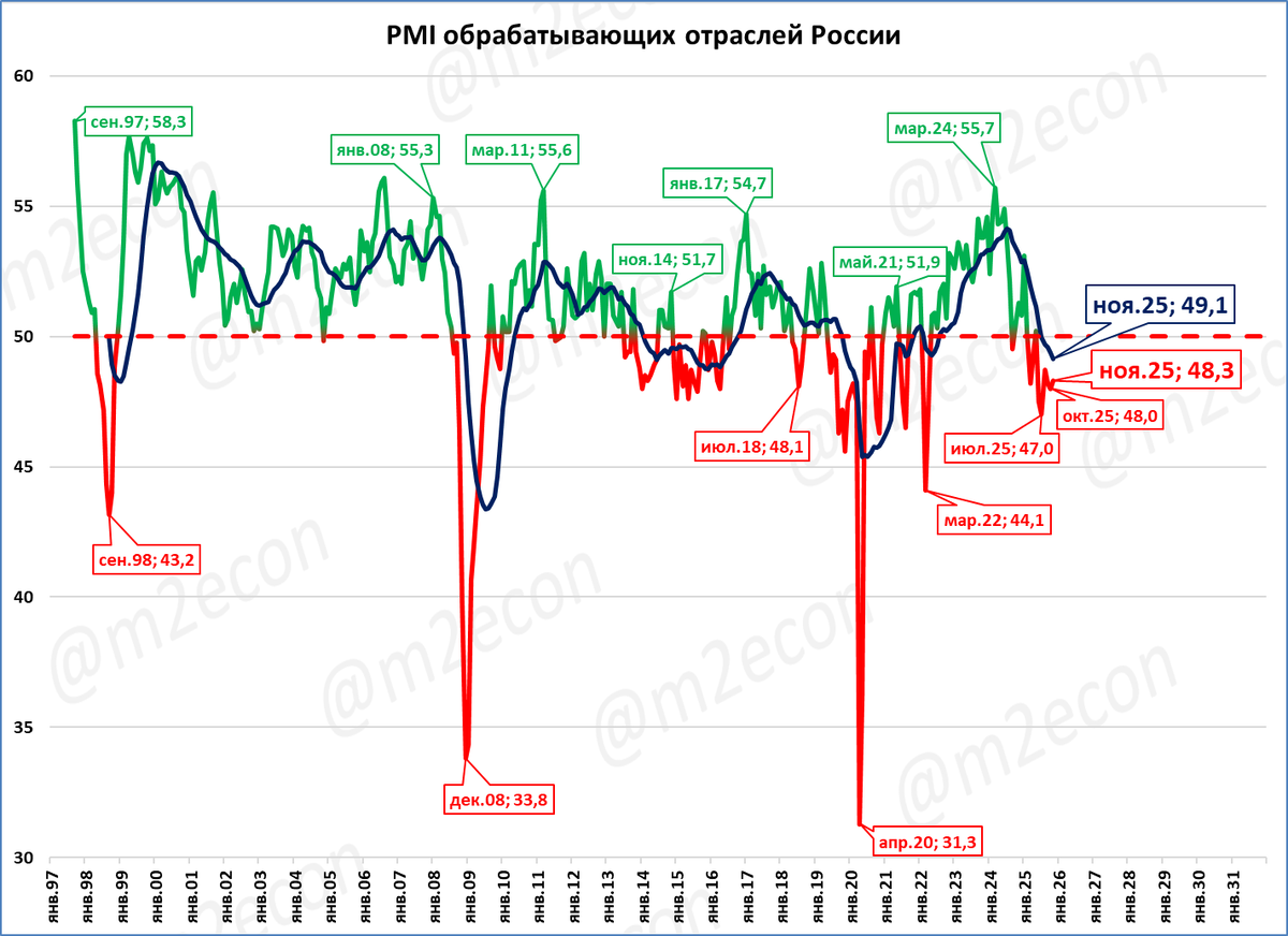 Индекс находится ниже 50 пунктов уже шестой месяц подряд, что означает снижение деловой активности (на графике выделено красным цветом).