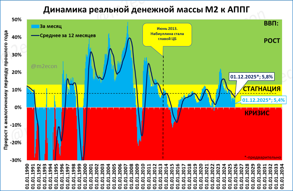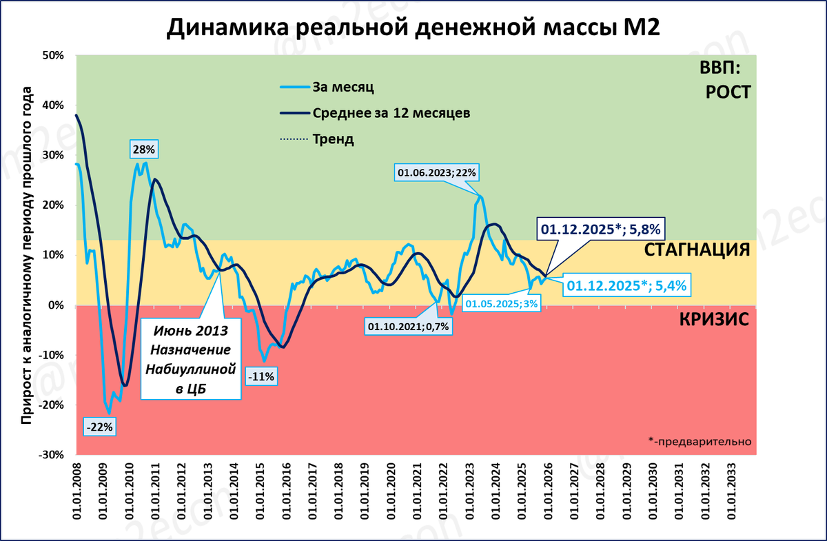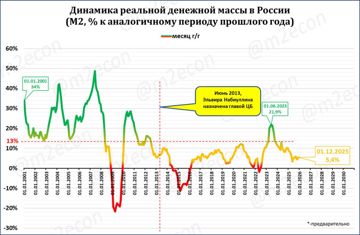 Помогает запомнить, что до 2013 года темп роста реальной денежной массы был преимущественно выше 13% годовых. А после 2013 года — преимущественно ниже 13% годовых.