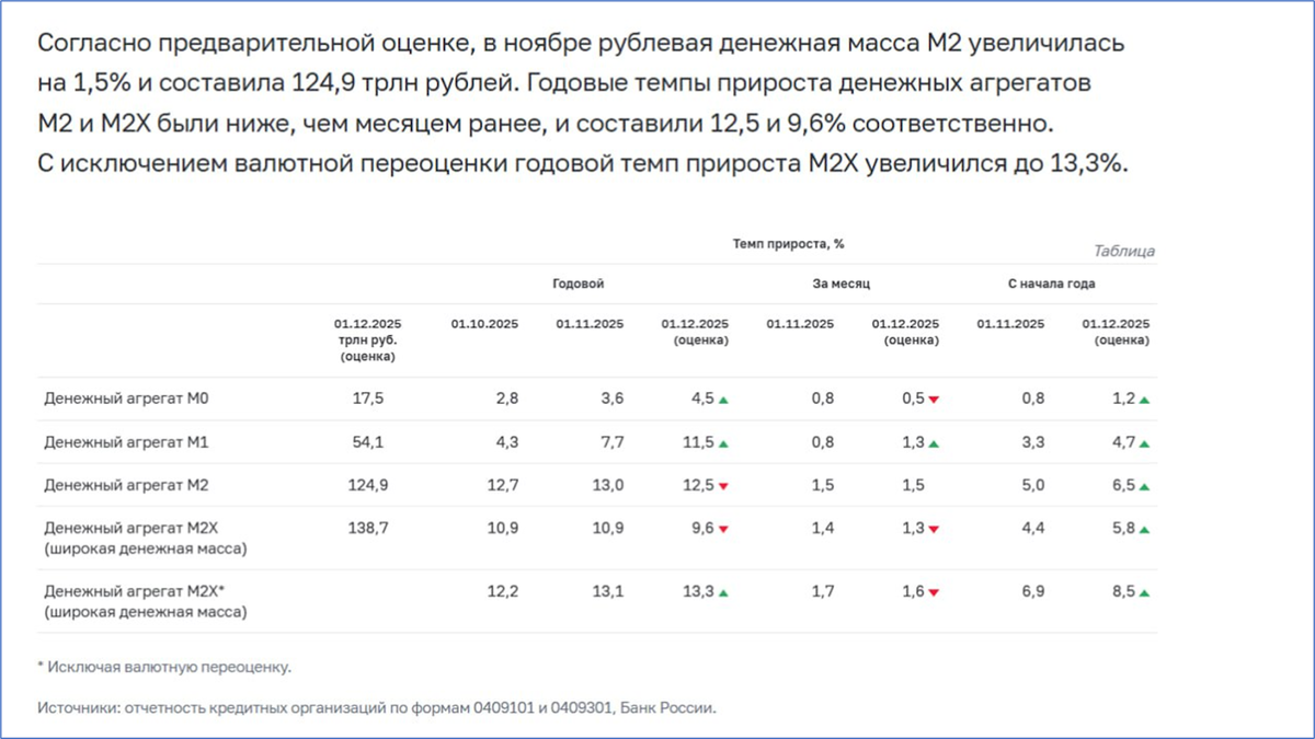 Денежная масса М2 на 1 декабря составила 124,9 трлн. рублей. Это исторический максимум.