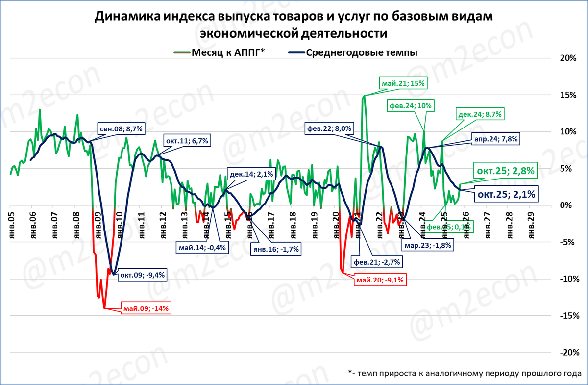 Выпуск базовых отраслей (составляют порядка 60% в структуре ВВП) за этот же месяц составил 2,8%.