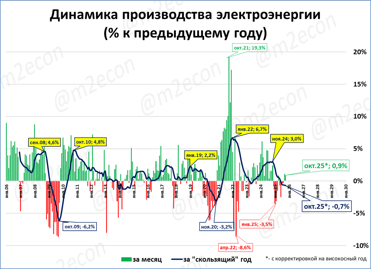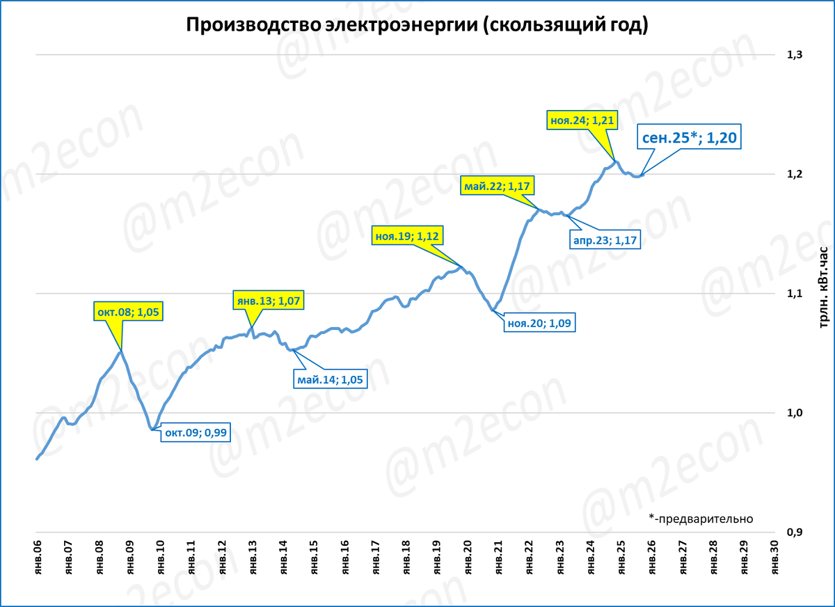 За последние 12 месяцев (скользящий год) было произведено 1,2 трлн киловатт-часов электроэнергии.