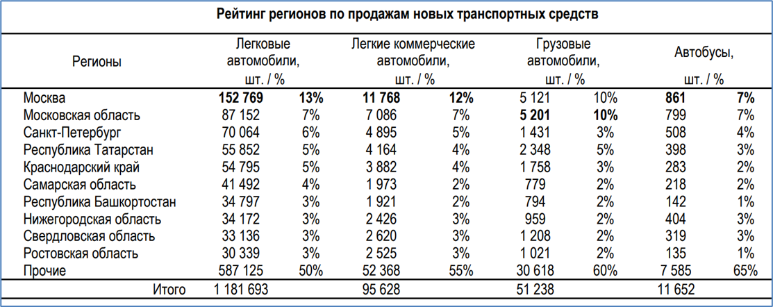 В грузовиках на столичный регион приходится 20% регистраций, в легковых автомобилях -- тоже 20%.