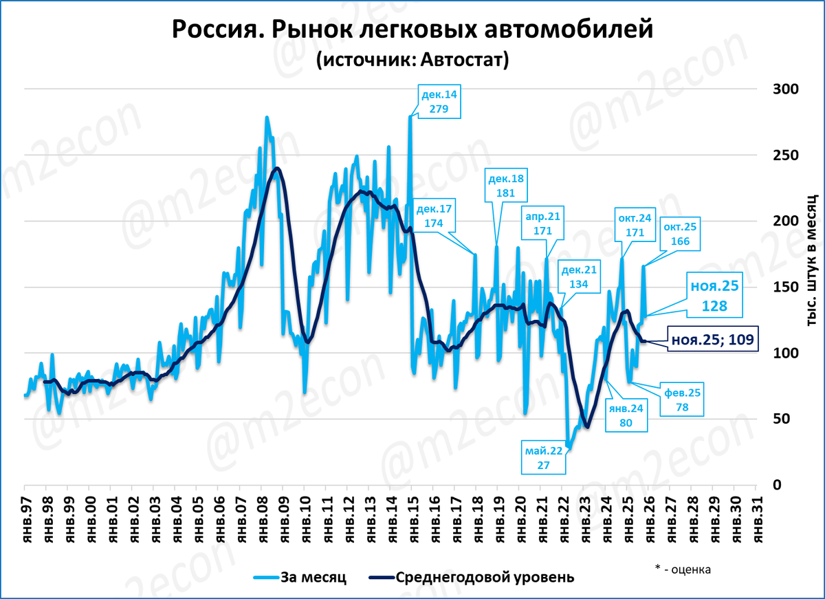 Рынок легковых в ноябре составил 128 тысяч (+5%). Это первый рост после 9 месяцев падения подряд.
