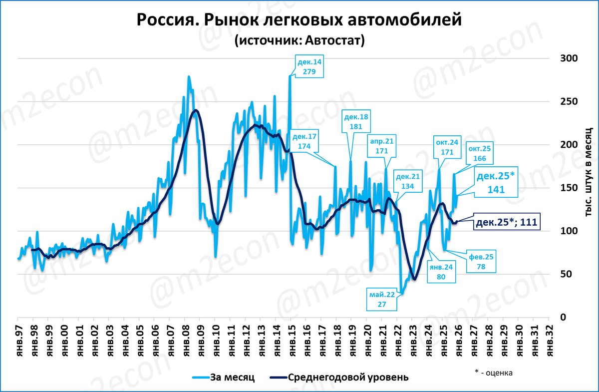 Рынок легковых автомобилей, судя данным 49 недели, в декабре составит 141 тыс. (+14%). Итоги 2025 года будут порядка 1,33 млн.