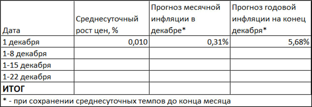 Но уже сейчас можно сделать первые предварительные прикидки итогов декабря. Если среднесуточный рост цен будет на уровне 0,010%, то по итогам декабря годовая инфляция может снизиться до 5,7%.