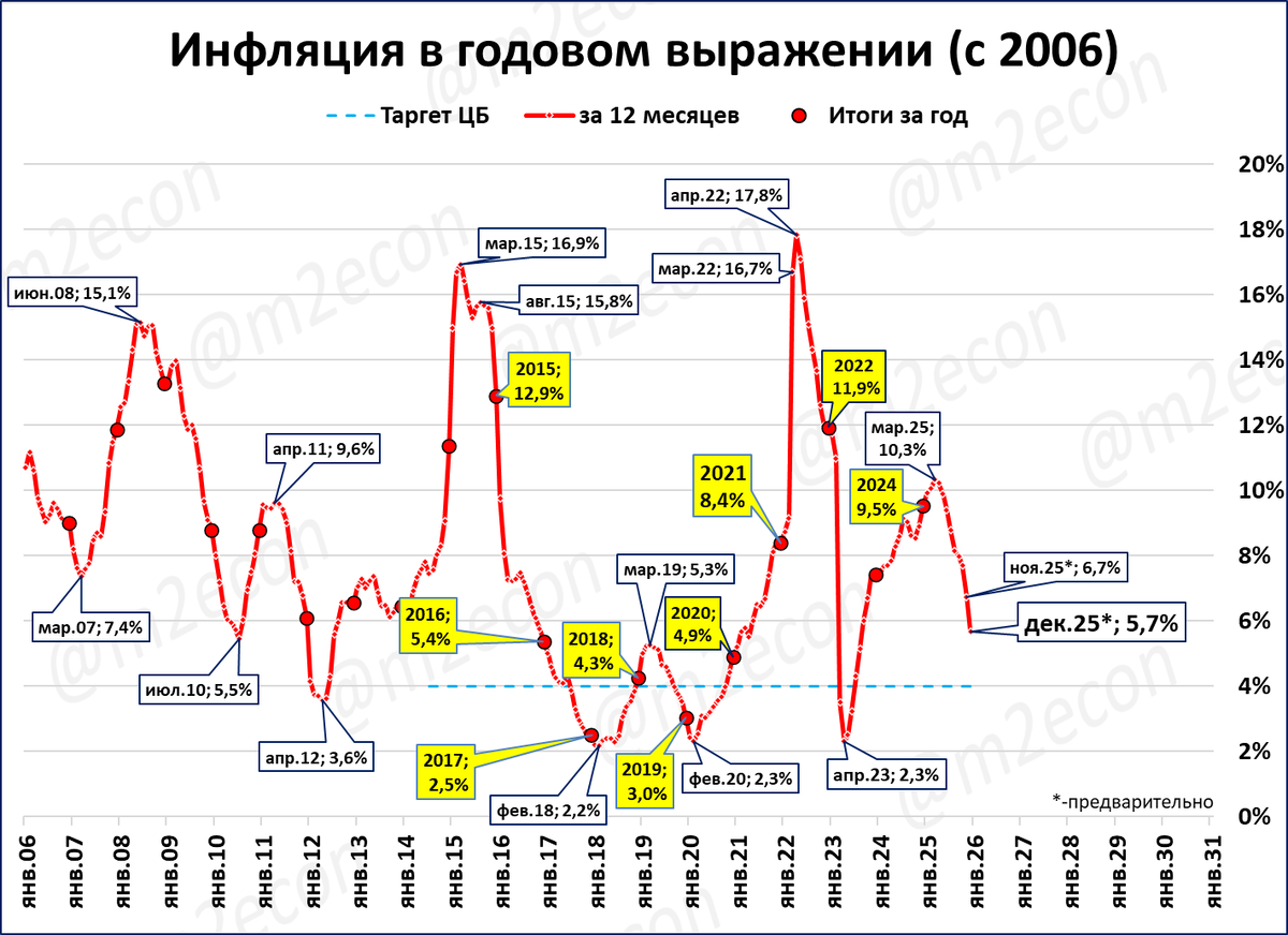 Инфляция по итогам декабря идёт на снижение до 5,7% годовых.