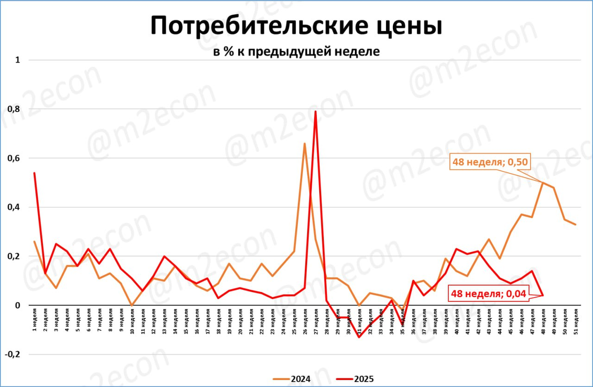 Рост цен за 48 неделю (0,04%) на порядок ниже, чем за 48 неделю прошлого года (0,50%).