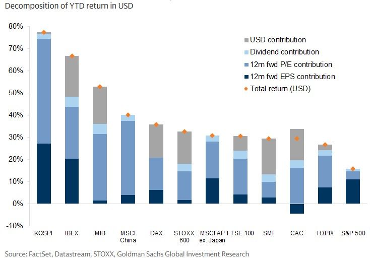 В этом году многие ключевые фондовые рынки сравнялись или превзошли Уолл-стрит, особенно после апрельских минимумов. S&P 500 вырос примерно на 15% с начала года, но индекс MSCI Asia ex-Japan прибавил почти 25%, а немецкий DAX и британский FTSE 100 - почти 20%. Прибыль на рынках за пределами США, выраженная в местной валюте, усиливается ослаблением доллара. Например, бразильский Bovespa вырос на 30% в локальной валюте и еще на 20 процентных пунктов - в долларовом выражении.