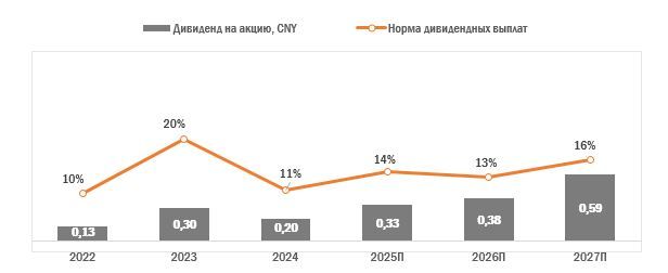В последние годы компания направляла около 10–20% чистой прибыли на выплату дивидендов. Мы ожидаем, что рост чистой прибыли в ближайшие годы даст менеджменту возможность увеличивать размер выплат. По нашим оценкам, в ближайшие 12 месяцев размер дивидендов может составить CNY 0,33 на акцию, что соответствует дивдоходности на уровне 0,5%.