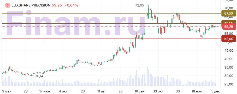 На дневном графике котировки Luxshare приблизились к ключевому уровню сопротивления в районе CNY 61. В случае уверенного пробоя этого уровня следующей целью для роста могут стать отметки, расположенные вблизи уровня CNY 67.
