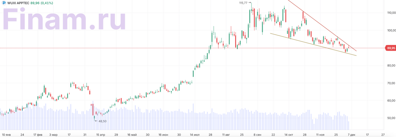В наше аналитическое покрытие по фарме и биотеху включены 2 акции с листингом в материковом Китае ― Livzon Pharmaceutical и WuXi AppTec. Livzon Pharmaceutical — один из ведущих производителей разнообразной фармацевтической продукции в Китае, фармацевтическая компания полного цикла. У Livzon 5 основных направлений деятельности: химико-фармацевтические препараты, фармацевтические субстанции (АФИ), диагностические реагенты и оборудование, препараты традиционной китайской медицины (ТКМ) и биологические продукты. Livzon Pharmaceutical стремится выйти на рынок терапии ожирения и диабета ― компания в числе первых китайских разработчиков дженериковой версии знаменитого семаглутида, компания уже завершила испытания третьей фазы по диабету 2-го типа и подала заявку на получение разрешения на коммерциализацию семаглутида по данному показанию. У компании стартовали испытания 3 фазы и по лишнему весу. Ранее в этом году бумага показывала динамичный рост, после чего ее рейтинг был понижен, но на текущий момент после локальной коррекционной просадки (в рамках «нисходящего клина») акции Livzon Pharmaceutical снова имеют рейтинг «Покупать», целевая цена 42,8 CNY, апсайд — 20%.