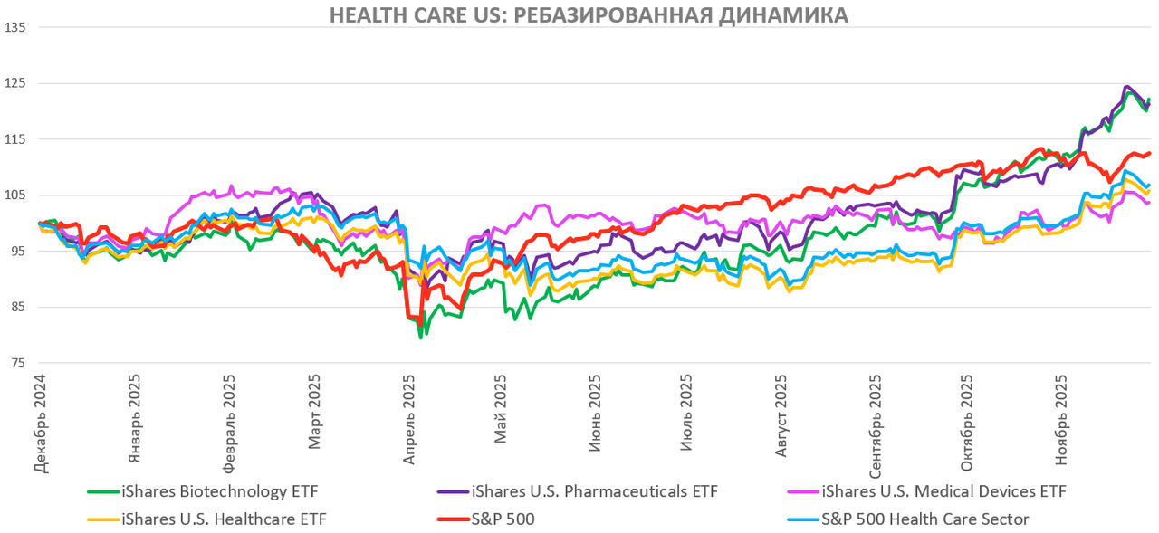 По ходу 2025 года наибольшие потери от всеобщих опасений относительно политики Трампа понесли компании биотехнологического сектора с малой и средней капитализацией, которые относятся к разряду высокорисковых вложений. Однако начиная с апреля в отрасли наметилась стабилизация, а затем динамичный отскок, и 2025 год она завершит с двузначным ростом. Восстановлению способствовало снижение регуляторных рисков ― стало понятно, что при желании с Трампом можно договориться, и фарма с биотехом не окажутся у разбитого корыта в результате его политики. Кроме того, несмотря на сокращения бюджета и штата, FDA в целом продолжает работу в обычном режиме и даже запускает новые ускоренные программы рассмотрения заявок. Еще один позитивный момент — соглашение Pfizer с Белым домом, по которому компания обязалась снизить цены на ряд своих препаратов в США. Все это показывает, что у отрасли есть практические способы избежать самых жестких мер по регулированию цен и тарифов.